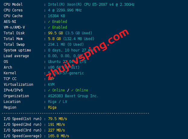 CPU型号Intel(R) Xeon(R) CPU E5-2697 v4,主频2.3GHz,启用了BBR,ASN是Baxet的,归属地拉脱维亚,当前硬盘I/O大致165MB/S的样子: