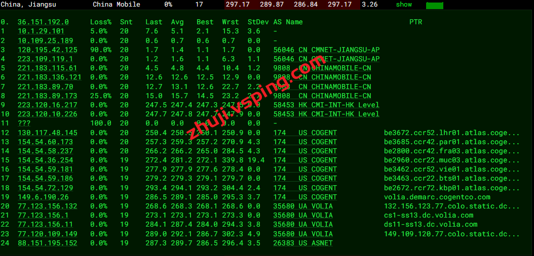 移动去程:直连移动香港节点对接COGENT转VOLIA去机房