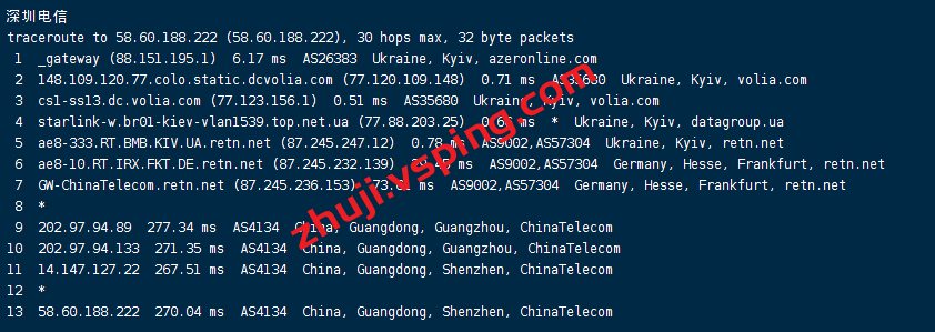电信回程:走volia转datagroup再转retn德国法兰克福回国