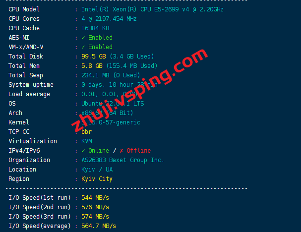 CPU型号Intel(R) Xeon(R) CPU E5-2699 v4,主频2.2GHz,启用了BBR,ASN是Baxet的,归属地乌克兰,当前硬盘I/O大致564MB/S的样子: