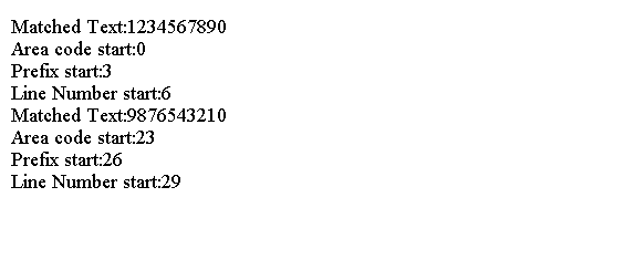 以下代码显示如何匹配10位电话号码,并为每个成功匹配打印每个组的开始。