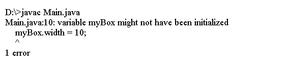 第一行声明 mybox 作为 Box 类型的对象的引用。此行执行后, mybox 包含值 null 。null表示 mybox 尚未指向实际对象。