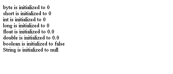 数字字段(字节,短,char,int,long,float和double)初始化为零。布尔字段初始化为false。引用类型字段初始化为null。