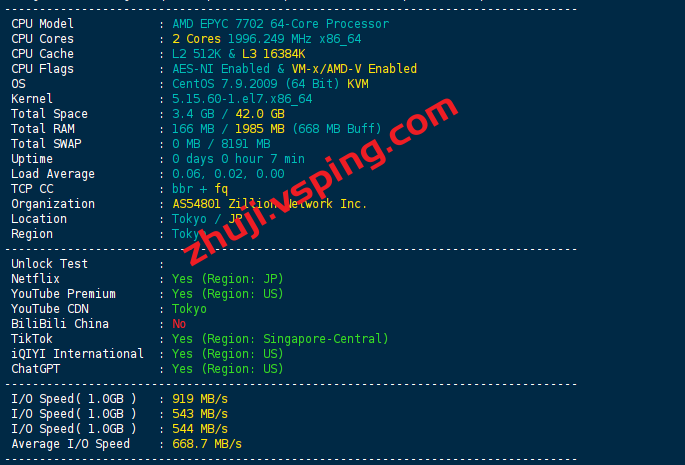 CPU型号AMD EPYC 7702 64-Core Processor,主频2.0GHz,启用了BBR,ASN是Zillion Network Inc的,归属地日本,当前硬盘I/O大致668.7MB/S的样子: