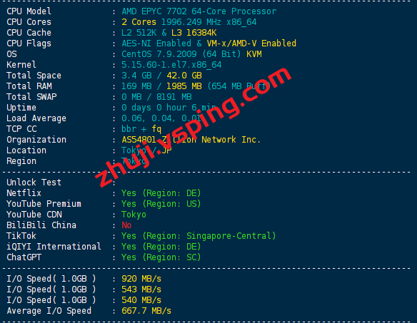 CPU型号AMD EPYC 7702 64-Core Processor,主频2.0GHz,启用了BBR,ASN是Zillion Network Inc的,归属地日本,当前硬盘I/O大致667.7MB/S的样子: