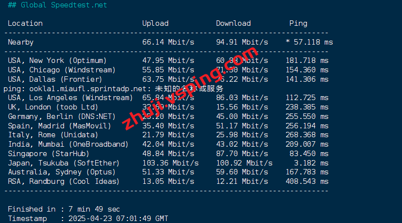 speedtest的国际节点测试结果: