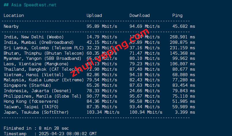 speedtest亚洲区域内的部分节点的测试数据: