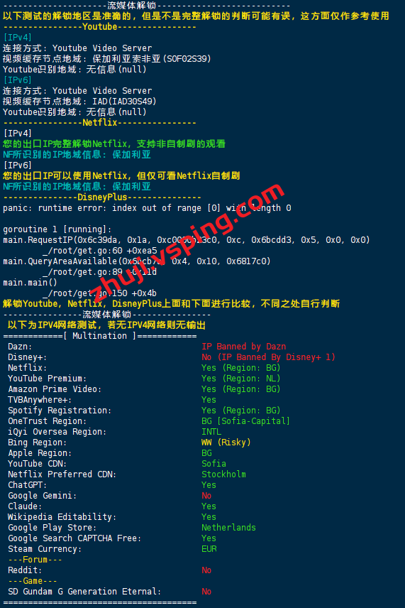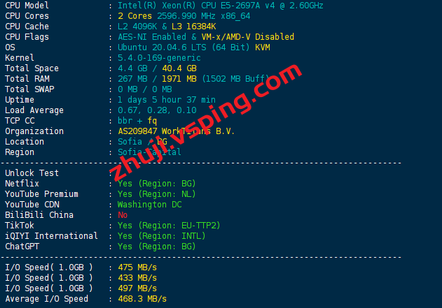 服务器用的CPU型号为Intel(R) Xeon(R) CPU E5-2697A v4 @ 2.60GHz,开启了BBR和 IPv6,AS209847 WorkTitans B.V.,归属地为保加利亚,当前I/O大致在468.3 MB/s的样子: