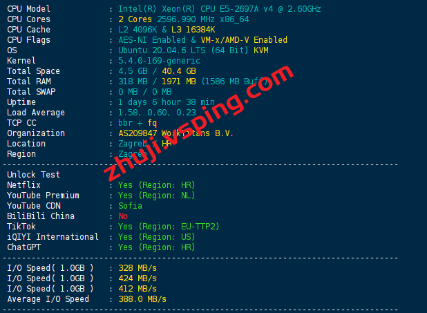 服务器用的CPU型号为Intel(R) Xeon(R) CPU E5-2697A v4 @ 2.60GHz,开启了BBR和 IPv6,AS209847 WorkTitans B.V.,归属地为克罗地亚,当前I/O大致在410.7 MB/s的样子: