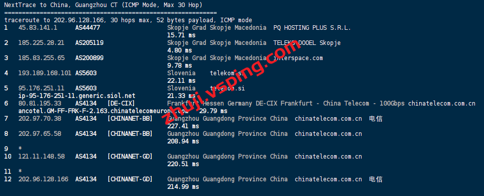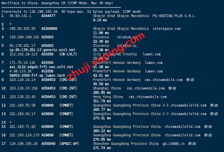 回程方面联通丢包,移动电信都是走德国回国。