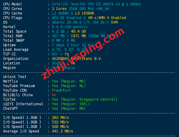 服务器用的CPU型号为Intel(R) Xeon(R) CPU E5-2697A v4 @ 2.60GHz,开启了BBR和 IPv6,AS209847 WorkTitans B.V.,归属地为北马其顿,当前I/O大致在441.3 MB/s的样子: