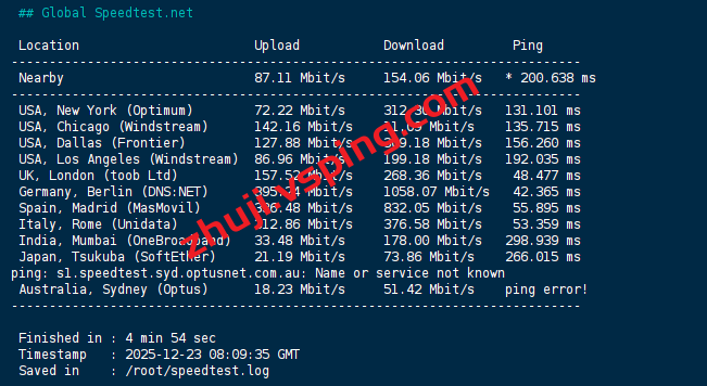 speedtest的部分国际节点的测试数据: