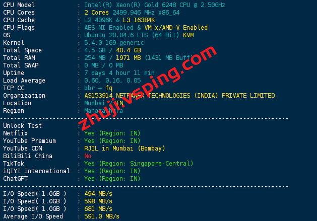 服务器用的CPU型号为Intel(R) Xeon(R) CPU E5-2697A v4 @ 2.60GHz,开启了BBR,AS209847 WorkTitans B.V.,归属地为印度,当前I/O大致在591 MB/s的样子: