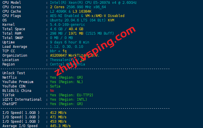 服务器用的CPU型号为Intel(R) Xeon(R) CPU E5-2697A v4 @ 2.60GHz,开启了BBR和 IPv6,AS209847 WorkTitans B.V.,归属地为希腊,当前I/O大致在445.3 MB/s的样子: