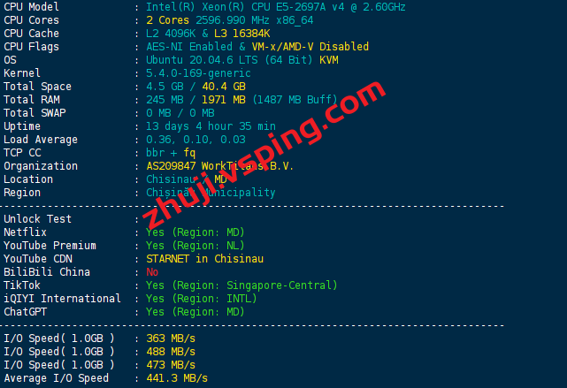 服务器用的CPU型号为Intel(R) Xeon(R) CPU E5-2697A v4 @ 2.60GHz,开启了BBR和 IPv6,AS209847 WorkTitans B.V.,归属地为摩尔多瓦,当前I/O大致在441.3 MB/s的样子: