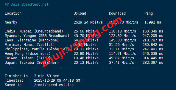 speedtest亚洲区域内的部分节点的测试数据: