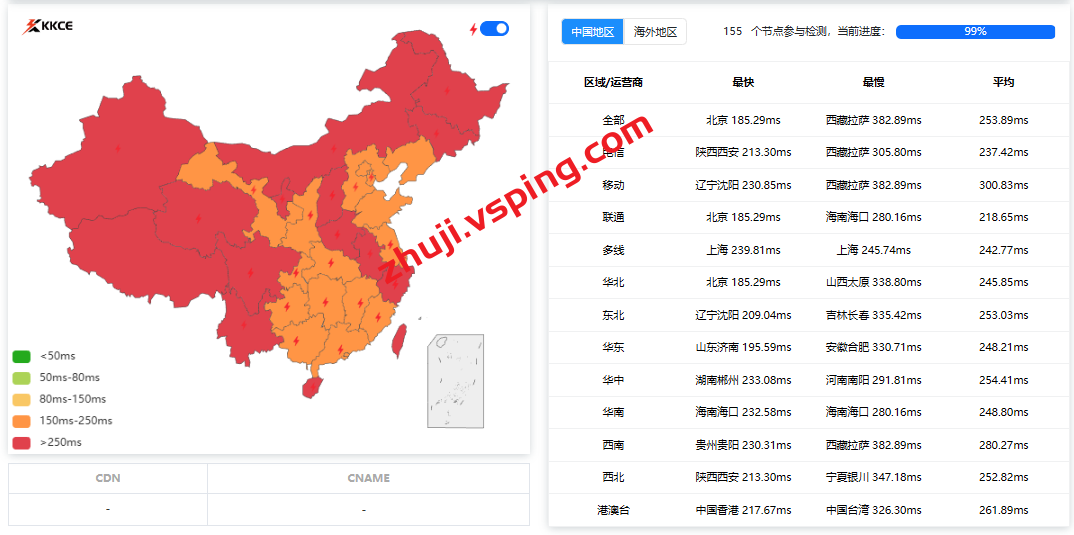 国内三网多节点的延迟测试数据:
