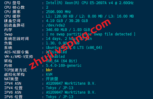 服务器用的CPU型号为Intel(R) Xeon(R) CPU E5-2697A v4 @ 2.60GHz,开启了BBR和 IPv6,AS209847 WorkTitans B.V.,归属地为日本,当前I/O大致在278 MB/s的样子: