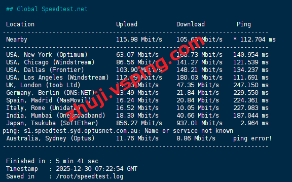 speedtest的部分国际节点的测试数据: