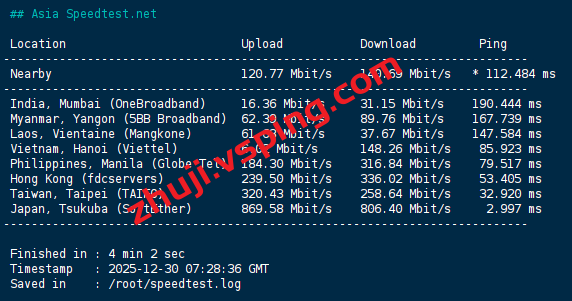 speedtest亚洲区域内的部分节点的测试数据: