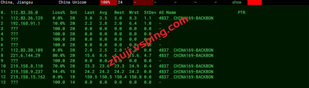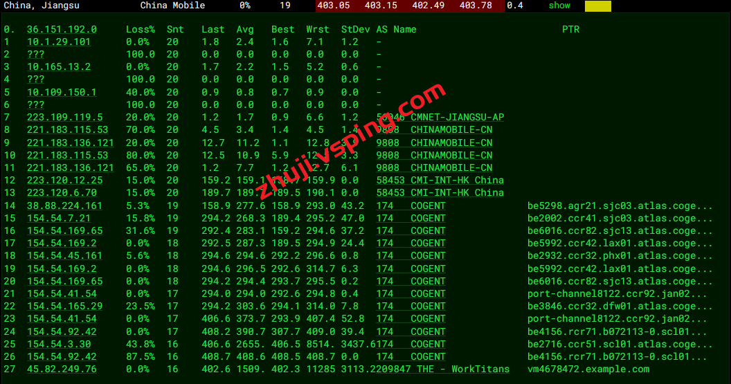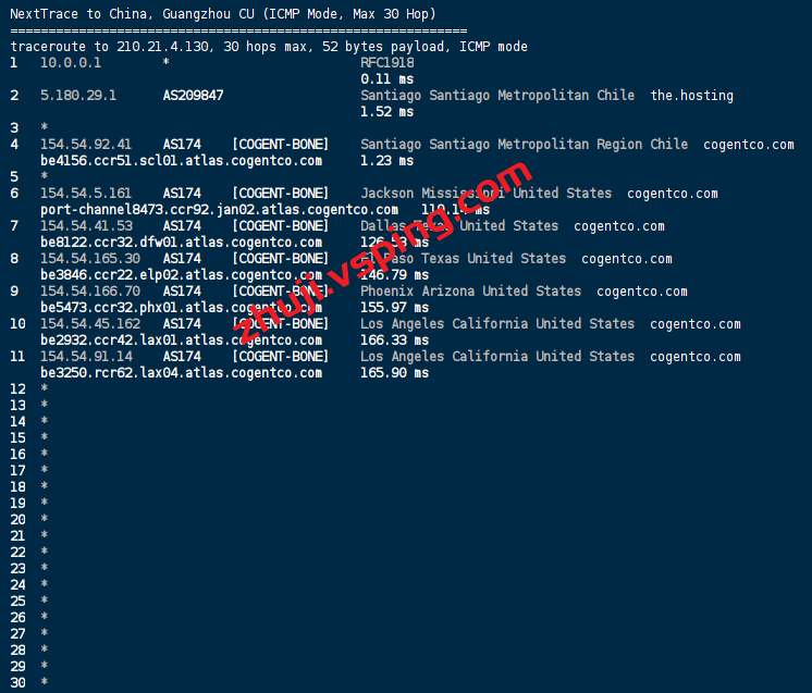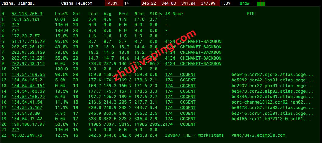 回程方面三网联通丢包,移动电信都是走COGENT绕美国回国。