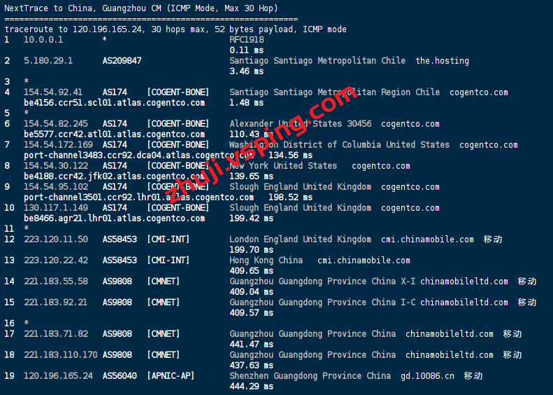移动回程: 走COGENT从美国经过 移动cmi线路回国