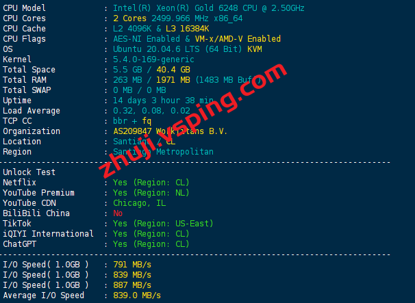 服务器用的CPU型号为Intel(R) Xeon(R) Gold 6248 CPU @ 2.50GHz,开启了BBR和 IPv6,AS209847 WorkTitans B.V.,归属地为智利,当前I/O大致在839 MB/s的样子: