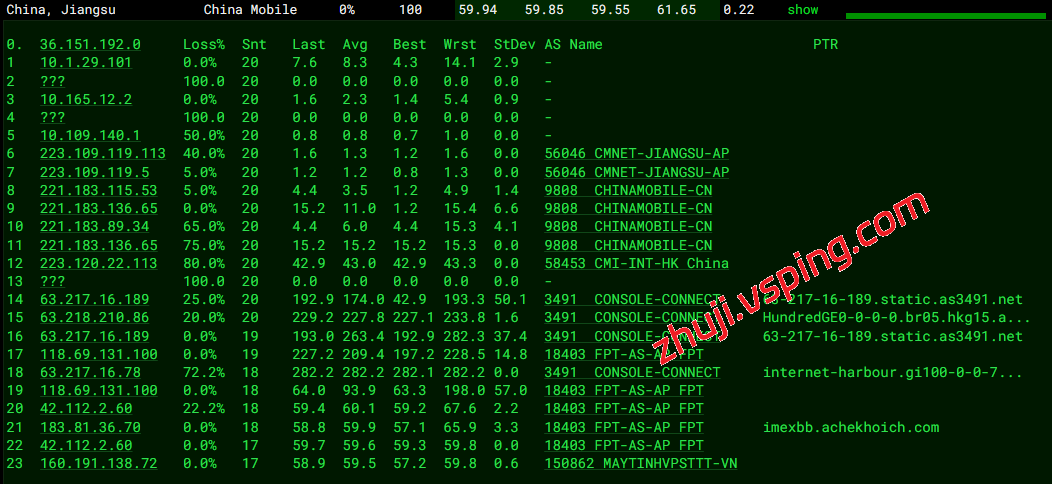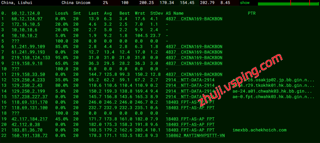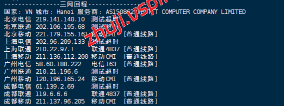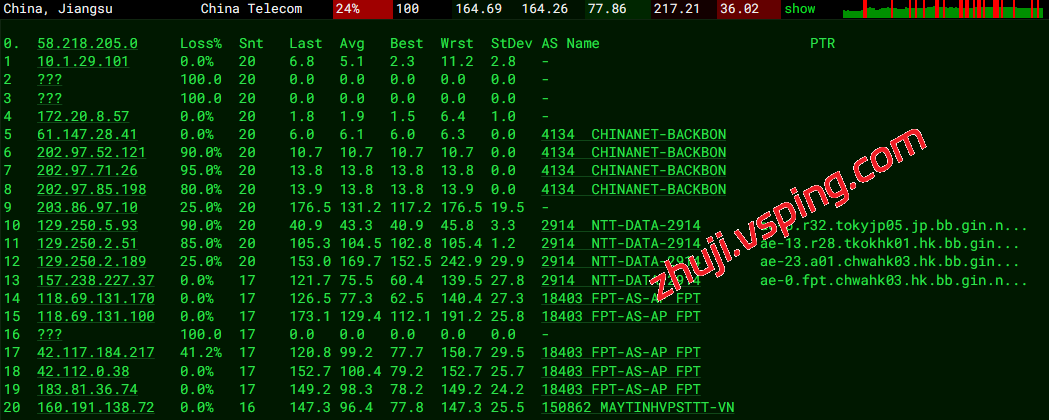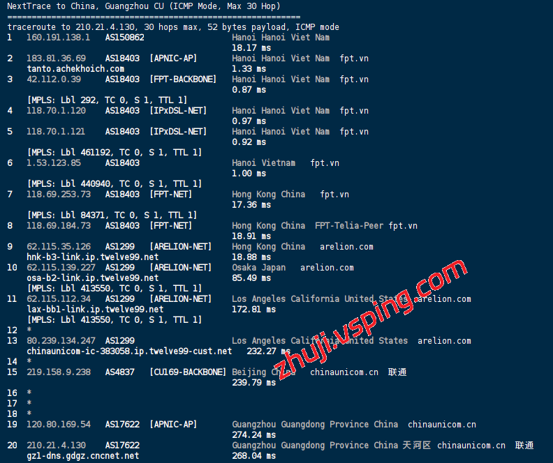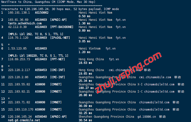 - 中国电信/联通:由境内骨干网直连,经 NTT 汇聚后接入越南本土运营商 FPT (fpt.vn) 直达机房。