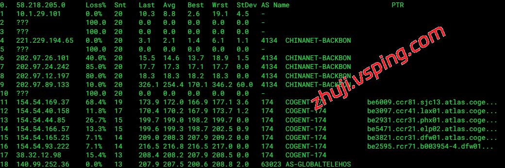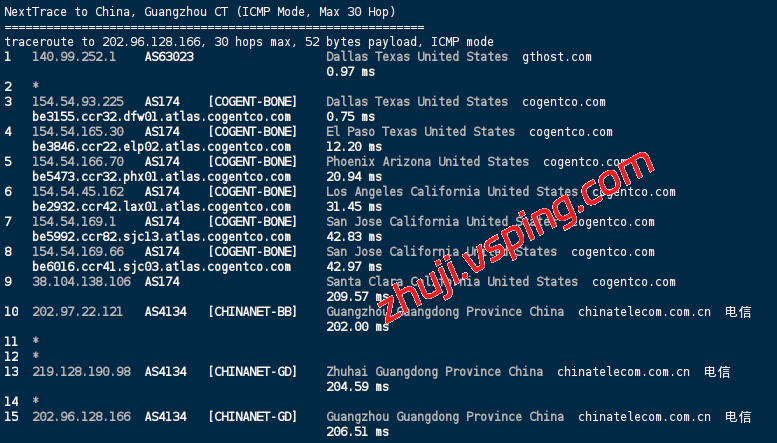 中国电信: 经由电信骨干网切入 Cogent (AS174),路径经由圣何塞、洛杉矶等多点中转,最终接入达拉斯,延迟稳定在 206ms 左右。