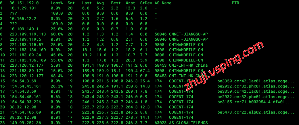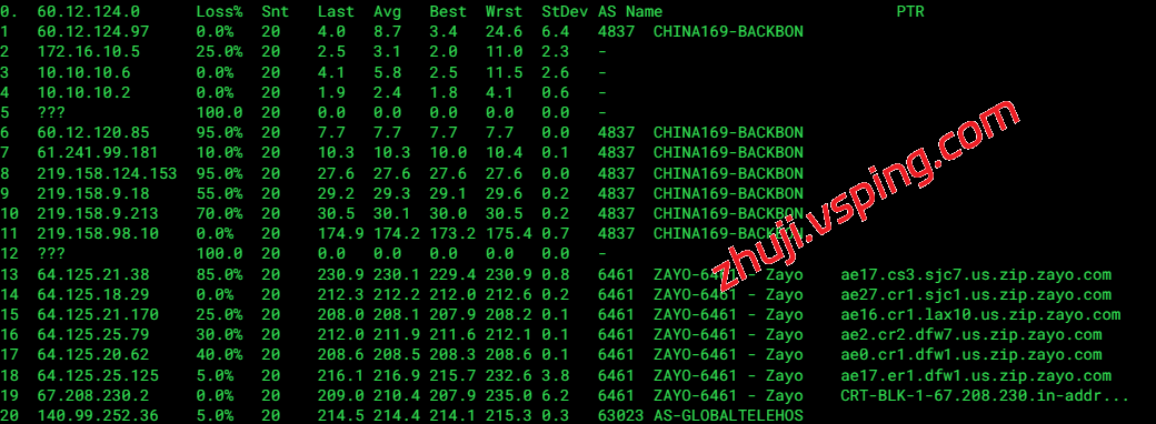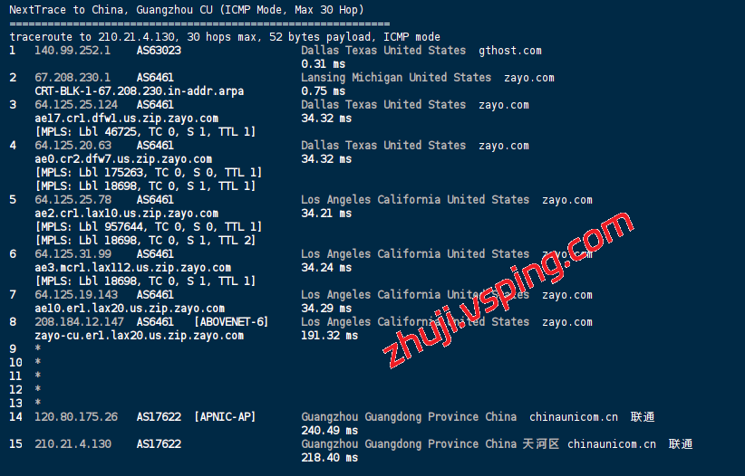 中国联通: 路径主要通过 Zayo (AS6461) 链路横跨北美大陆,延迟表现与电信持平。