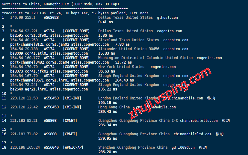 中国移动: 呈现出独特的“跨大西洋”路径。流量先经欧洲(伦敦 CMI)中转再跨海接入达拉斯,延迟处于 280ms 水平。