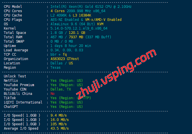 - 硬件规格: 搭载 Intel® Xeon® Gold 6152 处理器。作为 Intel 金牌架构中的高性能代表,该 CPU 具备极强的指令集效率。实测 4 核心并发 表现极其从容,配合 L3 16MB 缓存,在 AlmaLinux 9.6 环境下能够高效应对高频加解密(AES-NI 支持)及复杂逻辑运算。