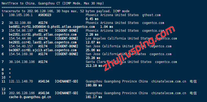 中国电信: 机房直连 Cogent,经圣何塞出口接 AS4134 (CHINANET) 骨干网回国,延迟约 181ms。
