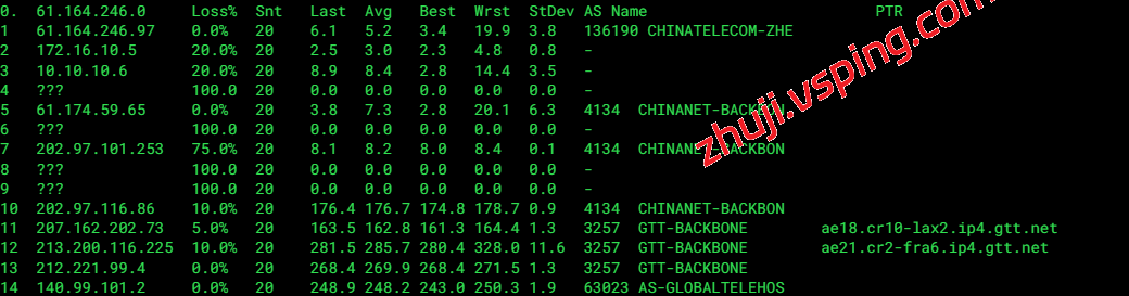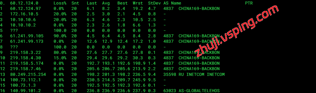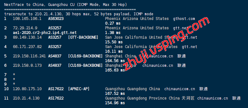 中国联通: 联通骨干网直出,同样经 GTT (AS3257) 骨干网直连。