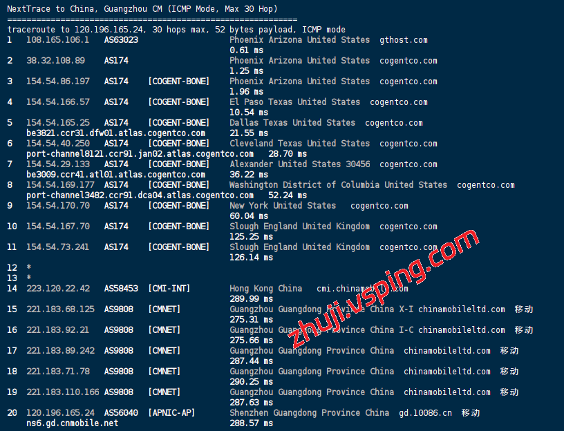 中国移动: 机房直连 Cogent,跨海接入 CMI (AS58453) 直回内地。受限于长距离路由切换,当前延迟约 288ms(建议配合 BBR 优化)。