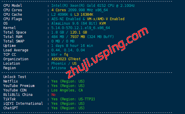 - 内存/系统: 标配 8GB RAM,运行 AlmaLinux 9.6 (64 Bit) 操作系统。TCP 拥塞控制协议采用 BBR + FQ 优化,显著提升长距离传输下的带宽利用率。