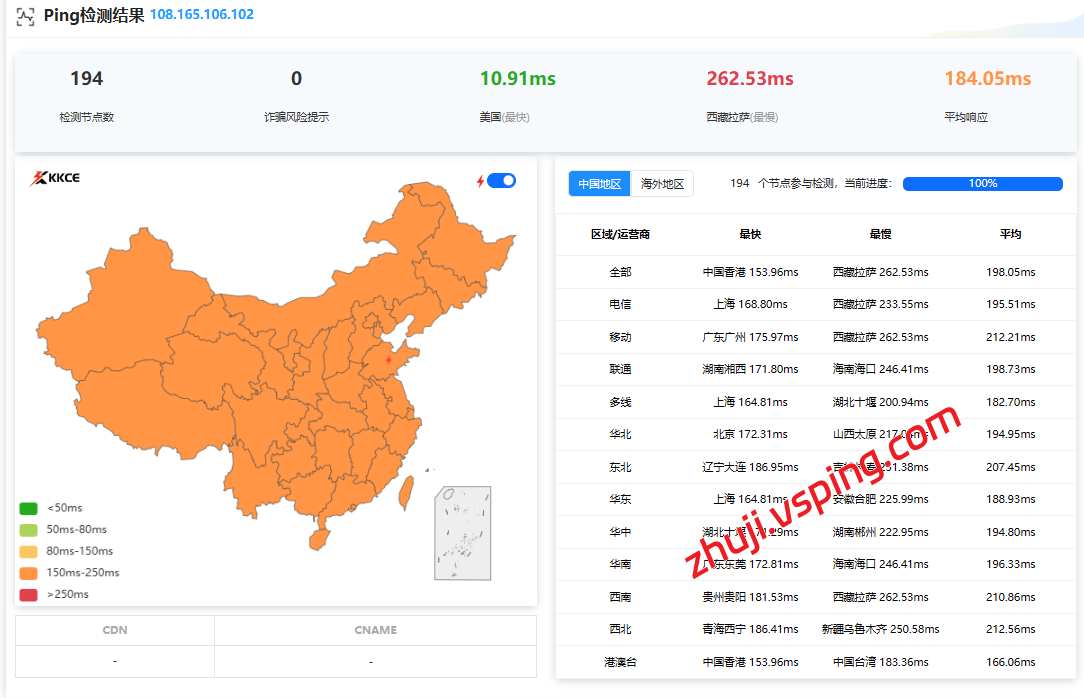 国内三网多节点的延迟测试数据: