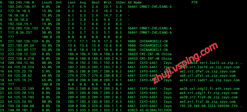 中国移动: 经移动国际出口进入 Cogent (AS174),通过洛杉矶中转直抵菲尼克斯。