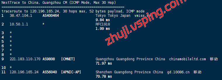中国移动 (China Mobile): 东京直连,强制经由 AS9808 (CMNET) 骨干网跨海直回,延迟控制在 70ms 左右,响应速度极快。
