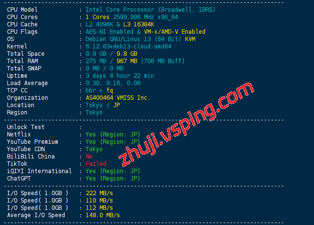 - 磁盘 I/O: 采用主流存储架构,实测 平均读写速度为 148.0 MB/s。读写表现均衡,足以支撑日常的 Web 服务、代理转发及轻量级数据库运行需求。