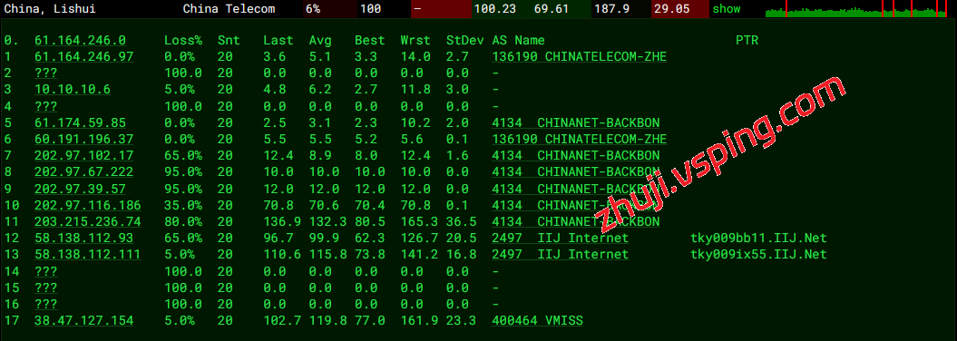 中国电信: 流量经由电信骨干网(CHINANET)出海,通过 IIJ (AS2497) 骨干网在日本东京汇聚后接入机房。