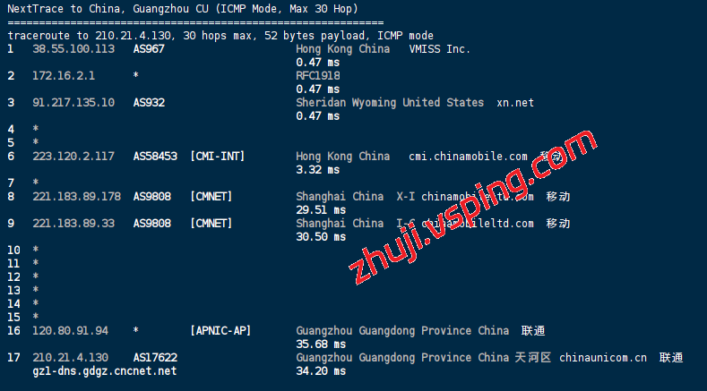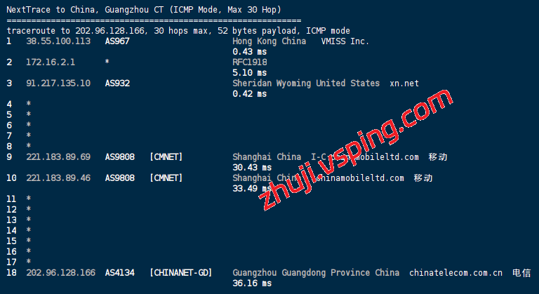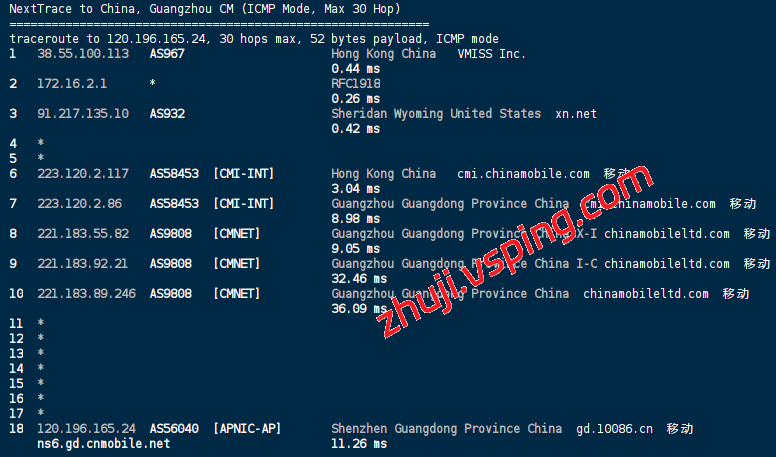 中国移动 (China Mobile): 纯正直连路由,通过 CMI (AS58453) 跨海路径极速直回广州,实测深圳方向延迟仅为 11ms 左右。