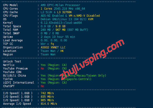 - 磁盘 I/O: 采用全闪存存储方案,实测 平均读写速度达 814.0 MB/s,峰值突破 865 MB/s,展现了极其卓越的数据吞吐性能,完美契合高性能应用场景。