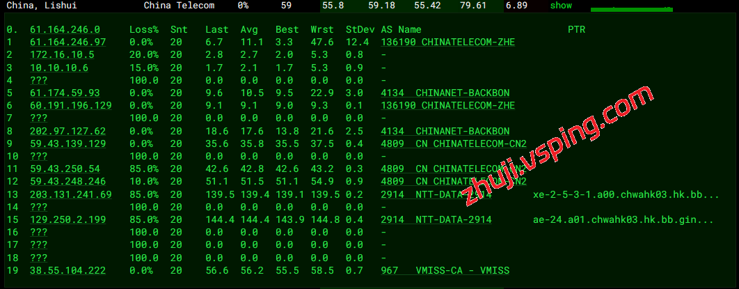 中国电信: 流量经由中国电信骨干网,通过 CN2 (AS4809) 精品链路出海,并在香港本地接驳接入。
