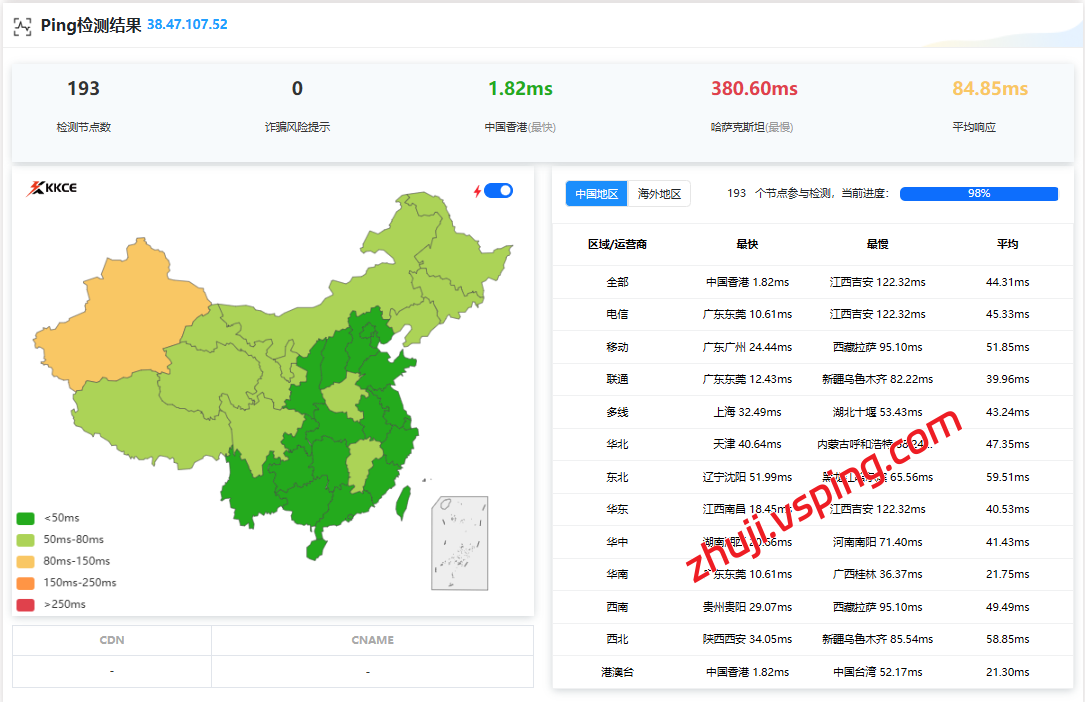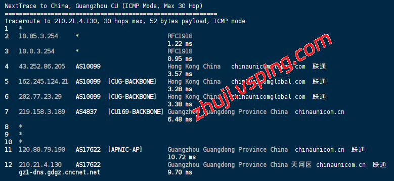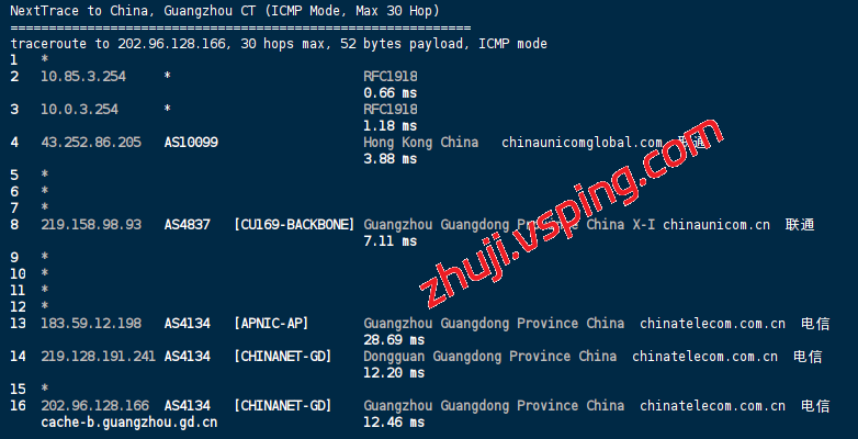 中国电信 (China Telecom): 香港直回,流量经由联通国际 AS10099 (CUG) 承载至广州出口,随后转入 AS4134 (CHINANET) 电信骨干网。