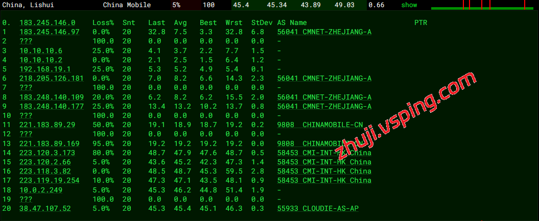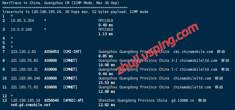 中国移动 (China Mobile): 流量经由 CMI (AS58453) 移动国际骨干网直回,实测延迟稳定在 12ms 左右。