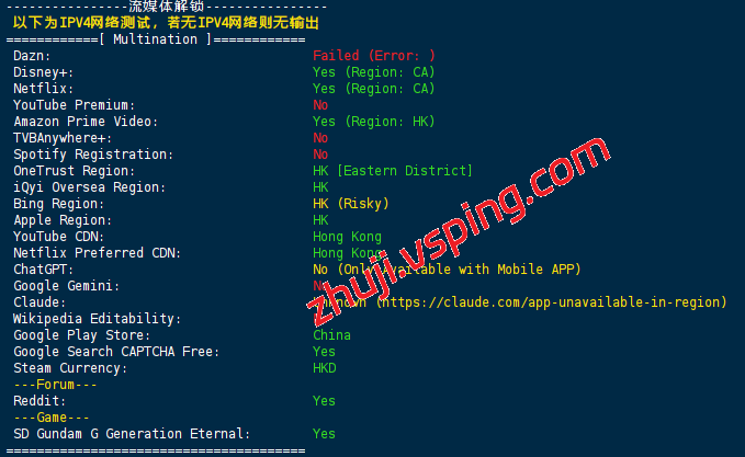 - IP 资产属性: 经实测,该节点分配的 IP 具备独特的跨区能力,可解锁 Netflix (CA – 加拿大区) 与 BiliBili (港澳台)。同时原生支持 iQIYI International (HK),适合作为港区流媒体备用节点。