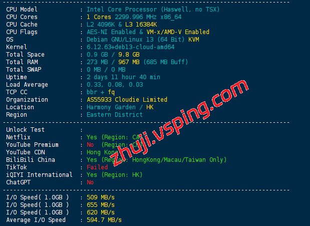 - 磁盘 I/O: 采用成熟的存储架构,实测 平均读写速度达 594.7 MB/s,峰值突破 655 MB/s。磁盘表现稳健,足以应对中等强度的 Web 服务与数据交换需求。