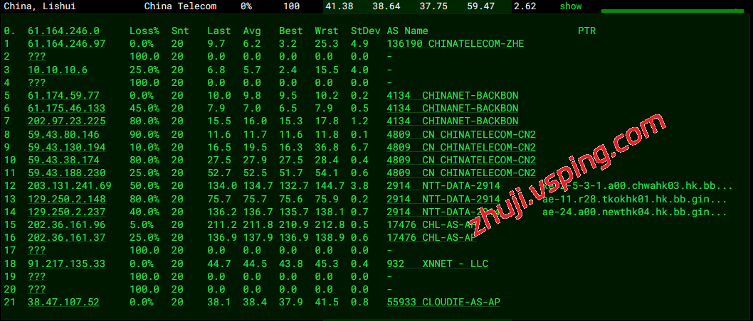 中国电信: 经由电信骨干网,在国际出口段接入 CN2 (AS4809) 精品链路,随后通过 NTT (AS2914) 链路在香港本地落地机房。